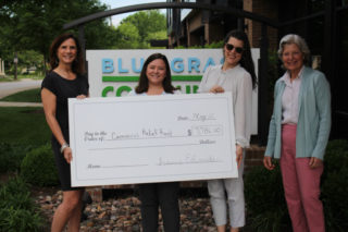 Nini Edwards, second from right, and Cathy Edwards, far right, present a check for $7,786 to the Coronavirus Relief Fund, which is facilitated by the Blue Grass Community Foundation and United Way of the Bluegrass. Accepting the check is Halee Cunningham, gift planning officer and deputy counsel for BGCF, second from left. Also pictured is Cindy Banks, executive director of the Winchester-Clark County Chamber of Commerce. The presentation was made at the BGCF offices on High Street in Lexington Friday. Nini Edwards said the money was raised from the local vineyard and winery’s sales of “adult Capri Suns,” which are pouches of sangria-style beverages. During April, $2 from each purchase of the drinks was put toward the Coronavirus Relief Fund efforts. (Photo by Whitney Leggett)